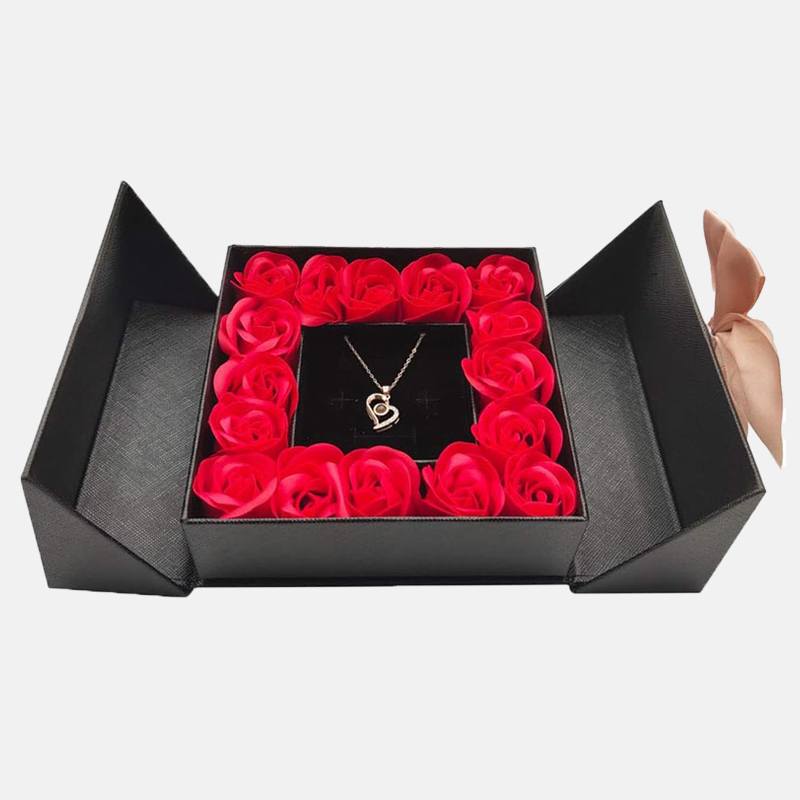 Подарочный набор 16 роз и кулон + Галактическая роза в стеклянной колбе с LED подсветкой