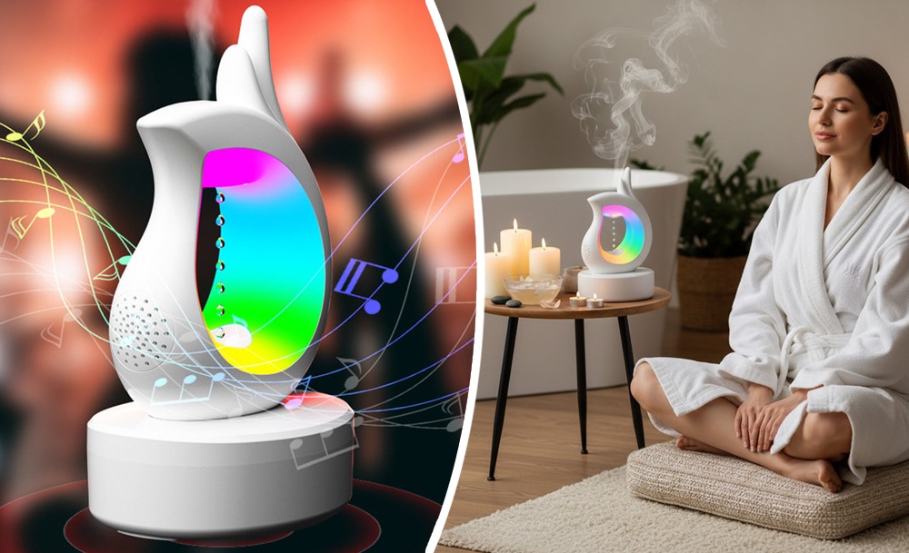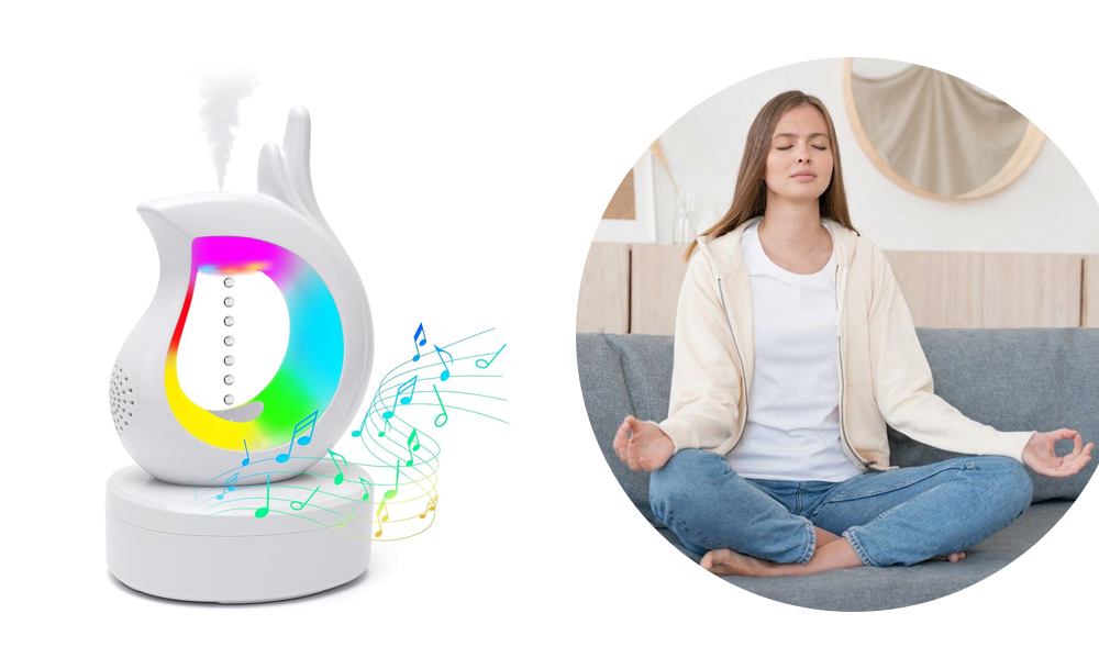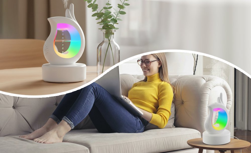 Встроенный ночной RGB предлагает мягкое освещение с возможностью изменения цвета. Дополнительная функция Bluetooth-динамик позволяет воспроизводить музыку или звуки природы со смартфона. Устройство работает тихо, потребляет мало энергии и легко наполняется водой. Идеально подходит для спальни, детской или офиса.