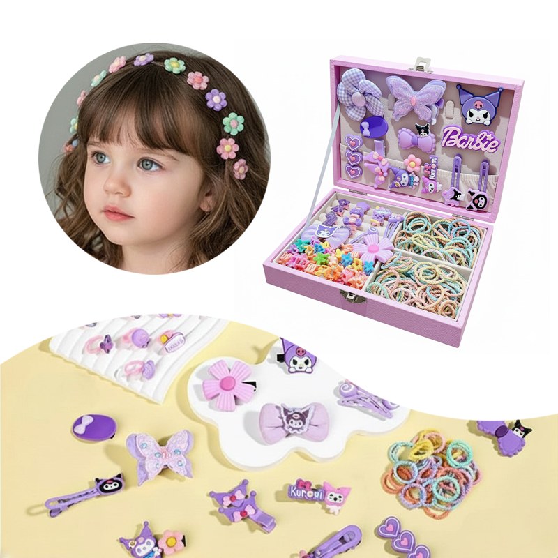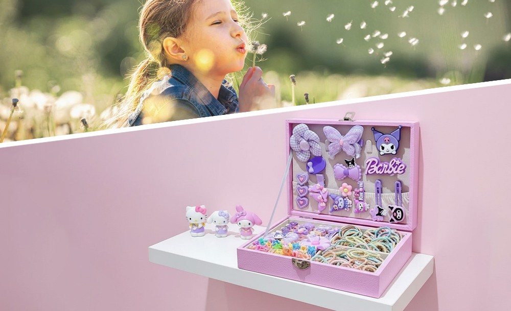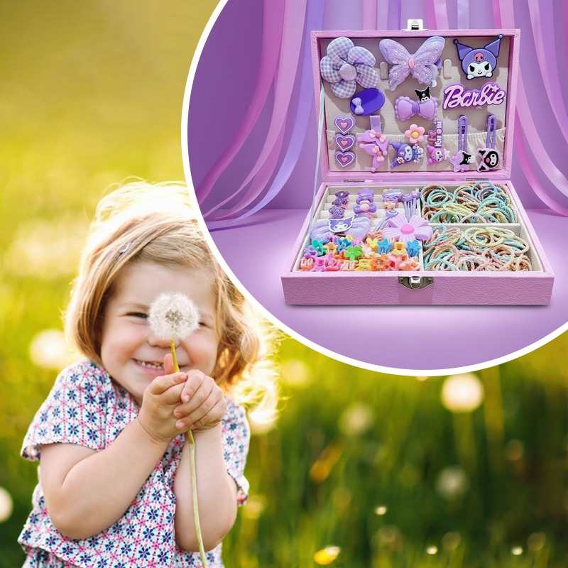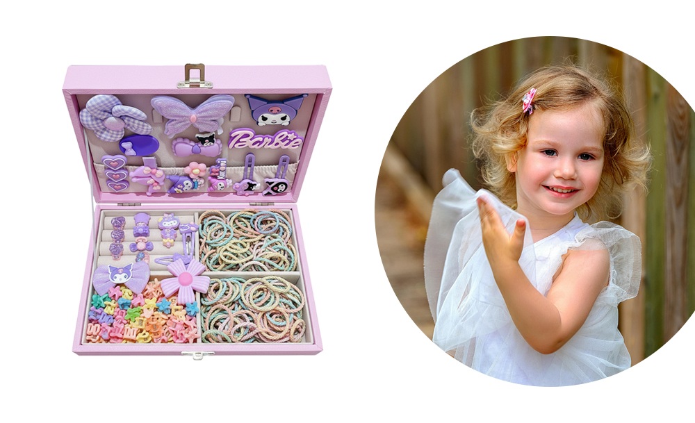 Все аксессуары размещены в многоуровневой коробке. Органайзер помогает поддерживать порядок и удобно хранить мелкие предметы. Набор идеально подходит для повседневного использования, а также для праздничных образов. Он развивает творчество и мелкую моторику при создании причесок. Аксессуары безопасны для детских волос.