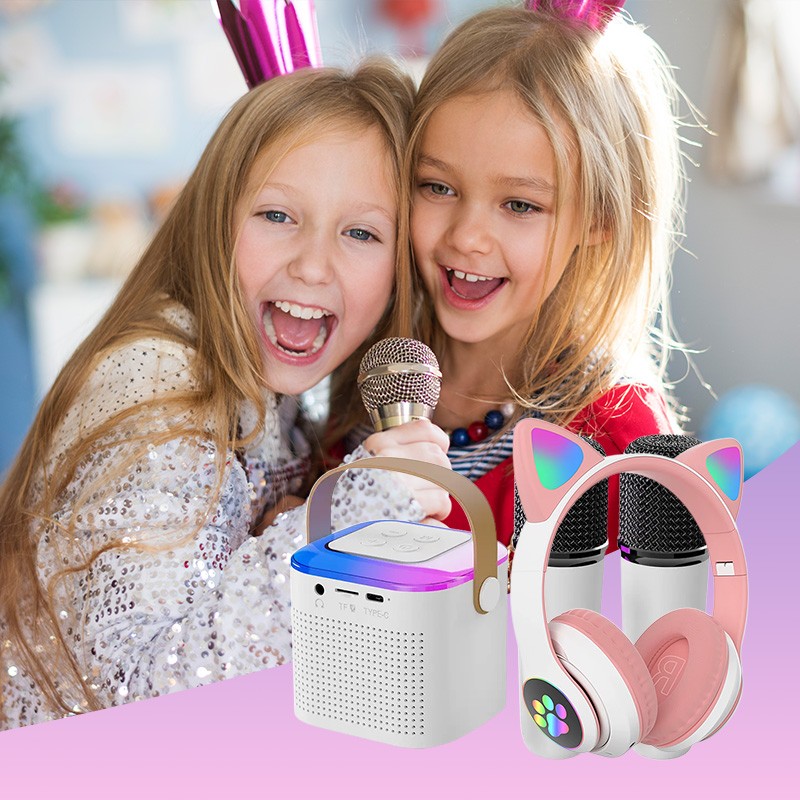 Караоке Bluetooth-колонка с 2 микрофонами + LED-наушники с кошачьими ушками — это яркий и увлекательный набор для всех любителей музыки и весёлого времяпрепровождения. Колонка позволяет петь любимые песни дома или на вечеринках, создавая атмосферу настоящего концерта. Два микрофона дают возможность петь вместе с друзьями или семьёй.