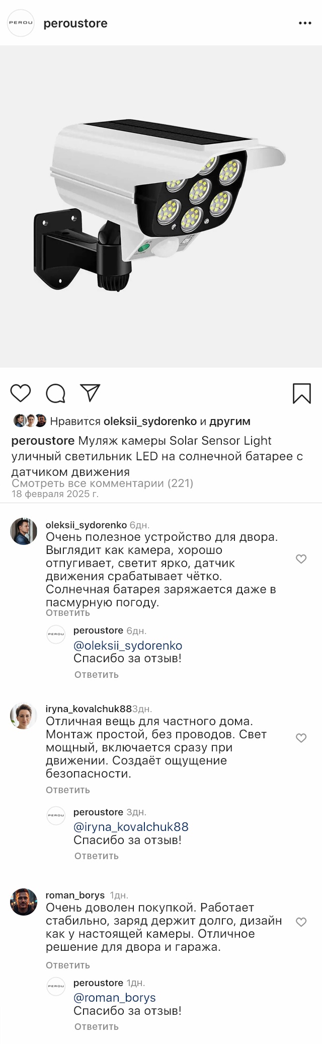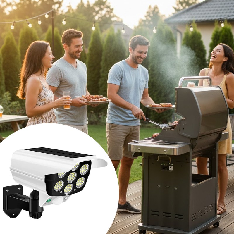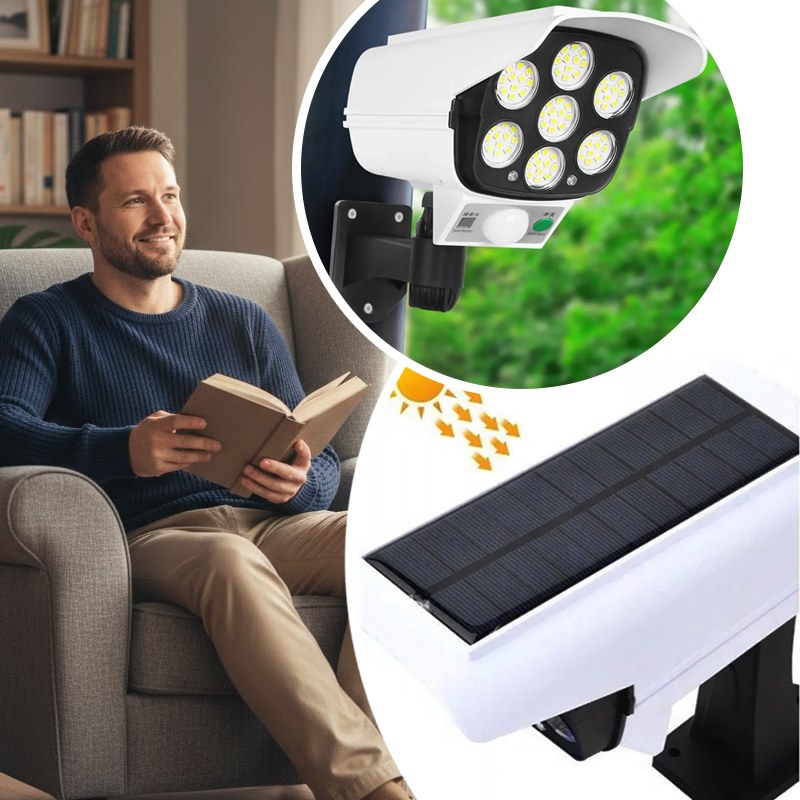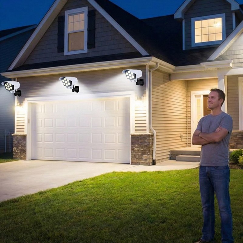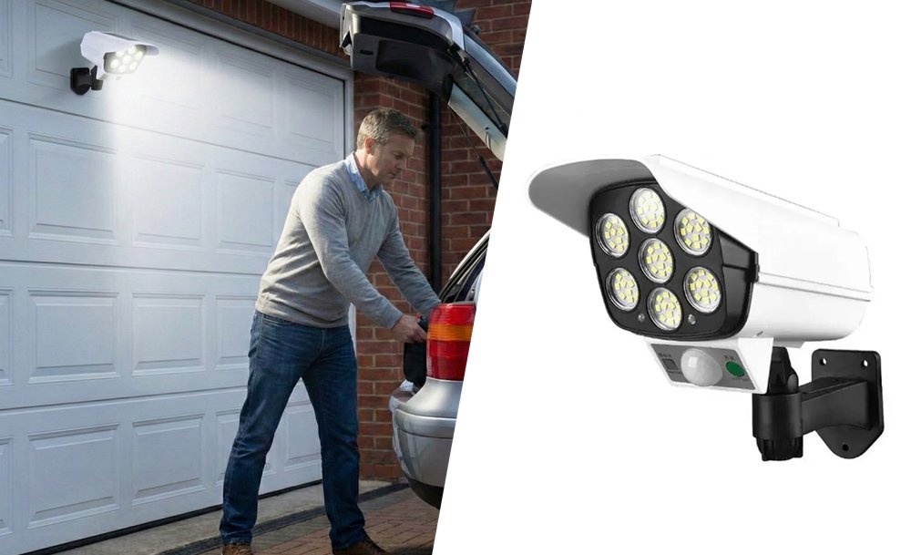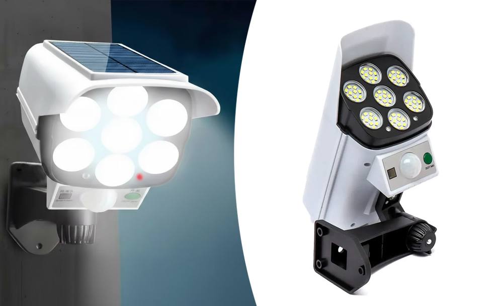 Главная особенность светильника – дизайн в виде камеры видеонаблюдения. Такой внешний вид сам по себе отпугивает нежеланных гостей. Инфракрасный датчик реагирует на движение на расстоянии нескольких метров. Водонепроницаемый корпус позволяет использовать прибор в любую погоду.