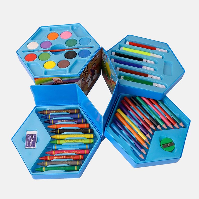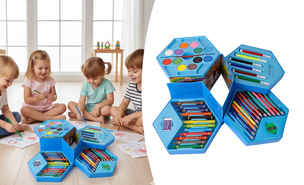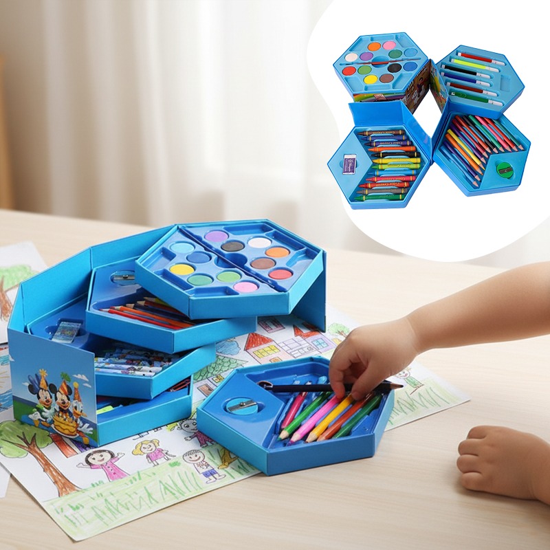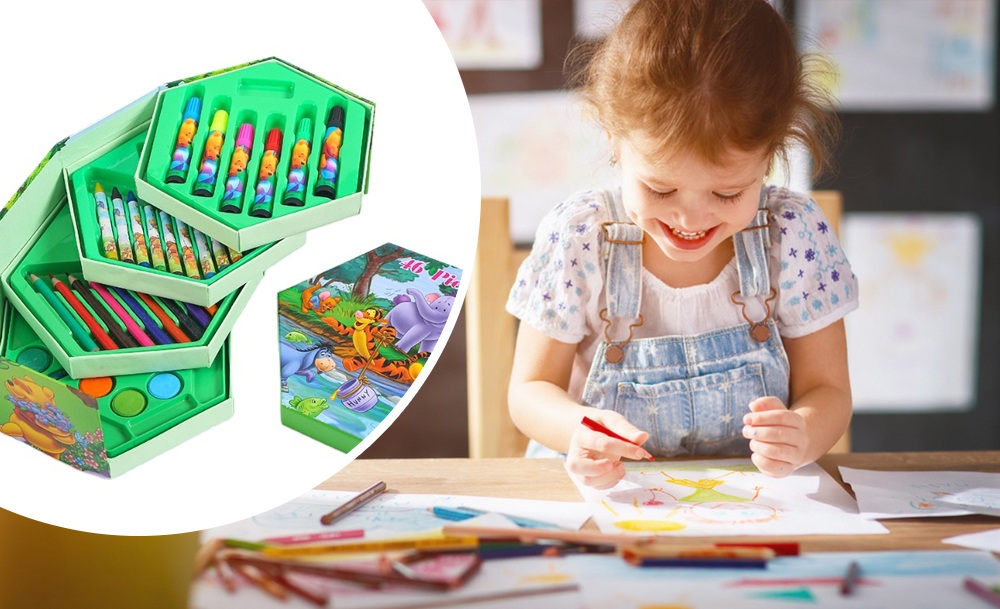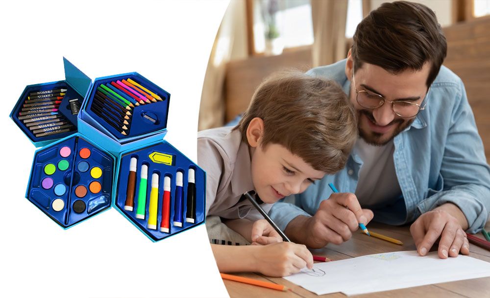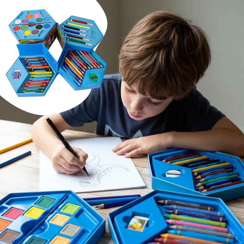 Этот универсальный набор предлагает 46 инструментов для юных художников и художниц. В нем собраны основные материалы для рисования и раскрашивания. Набор расположен в удобном кейсе для хранения и транспортировки, что помогает организовать рабочее место.