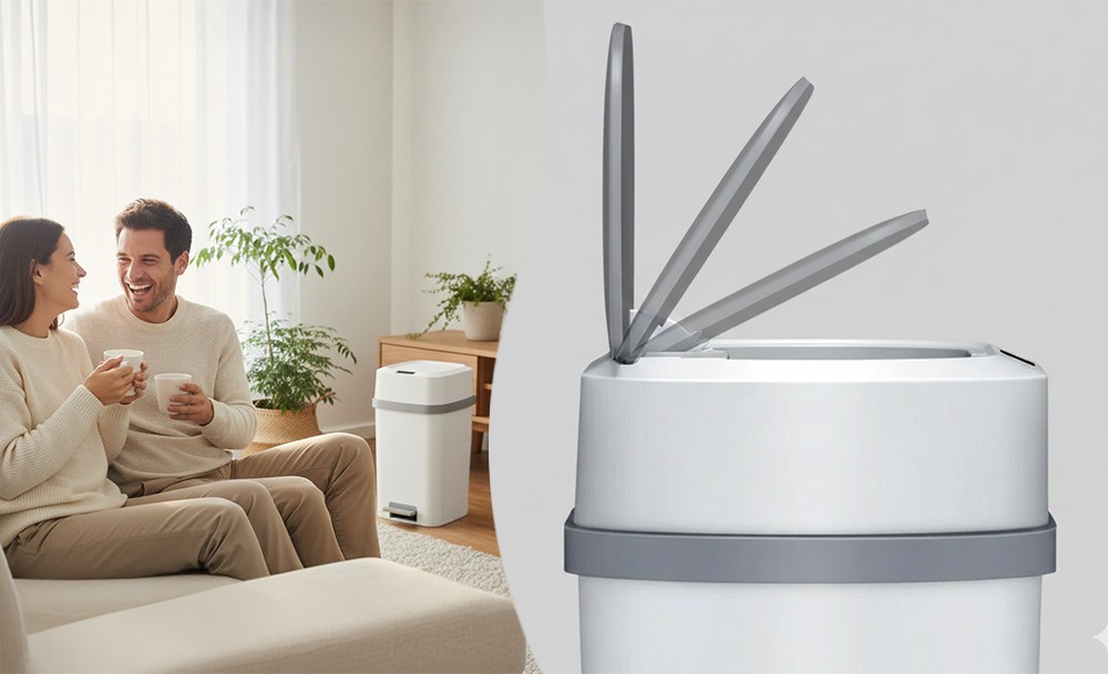 Устройство работает тихо и плавно, не создавая лишнего шума, а герметичная крышка надежно удерживает запахи внутри. Стильный минималистичный дизайн гармонично вписывается в любой интерьер – от квартиры до офиса. Корпус изготовлен из прочного влагостойкого материала, устойчивого к загрязнениям и простого в уходе.