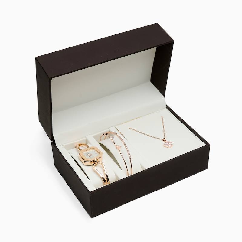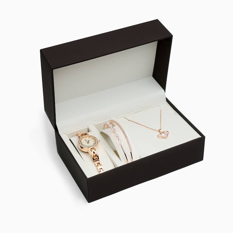 Женский подарочный набор представлен в разных вариантах – часы, двойной тонкий браслет и дополнительный браслет или подвеска на цепочке. Небольшие часики с белым циферблатом на оригинальном браслете создадут утонченный образ.