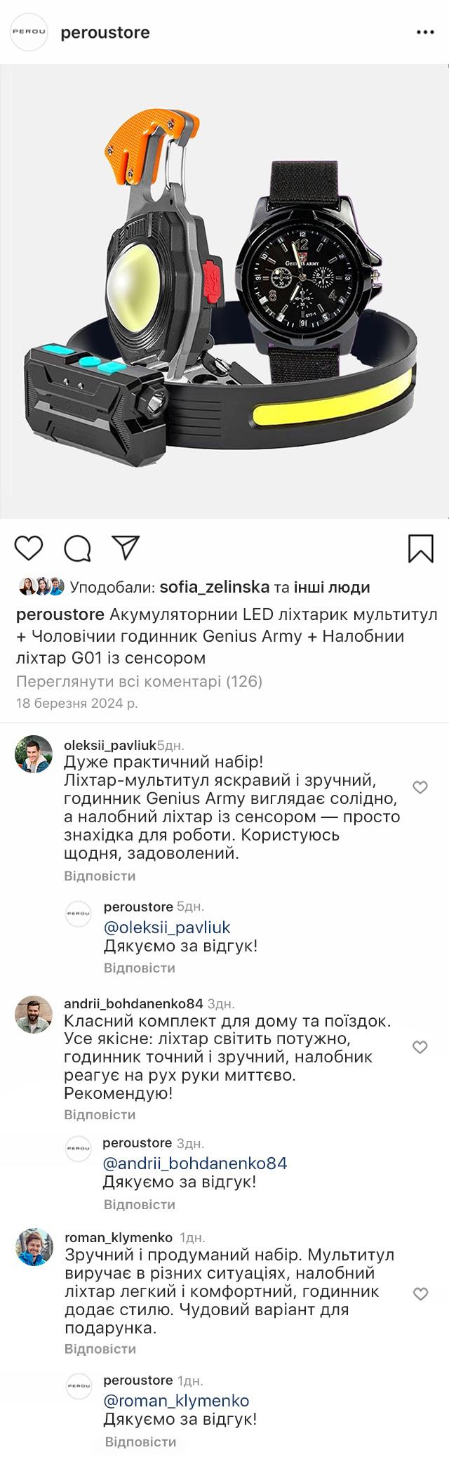 Акумуляторний LED ліхтарик мультитул поєднує яскраве освітлення та кілька корисних функцій для щоденного використання. Компактний, зручний у руці, підходить для дому, авто чи подорожей. Чоловічий годинник Genius Army має міцний корпус і виразний дизайн. Надійний механізм і зручний ремінець роблять його хорошим варіантом на кожен день. Налобний ліхтар G01 із сенсором дозволяє вмикати світло рухом руки, залишаючи руки вільними. Має кілька режимів освітлення та зручний регульований ремінь для комфортного використання.