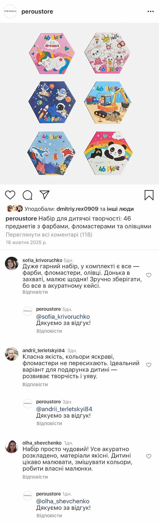 Всередині дитина знайде акварельні фарби, які легко змішуються для створення нових відтінків. Для чітких ліній та яскравих акцентів в наборі передбачені фломастери. А кольорові олівці чудово підійдуть для деталізації та роботи з текстурою.