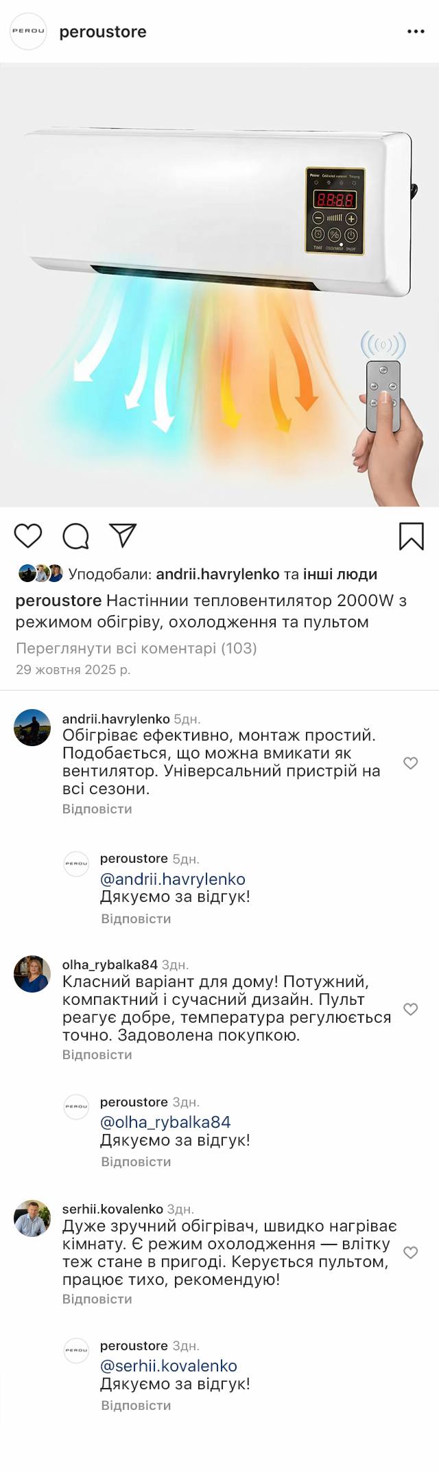 Настінний тепловентилятор 2000W забезпечує швидке регулювання температури в приміщенні. Пристрій функціонує у трьох режимах: обігрів (максимальна потужність 2000 Вт), охолодження (режим вентилятора) та вентиляція без нагріву. Оптимальний для приміщень площею до 25 м².