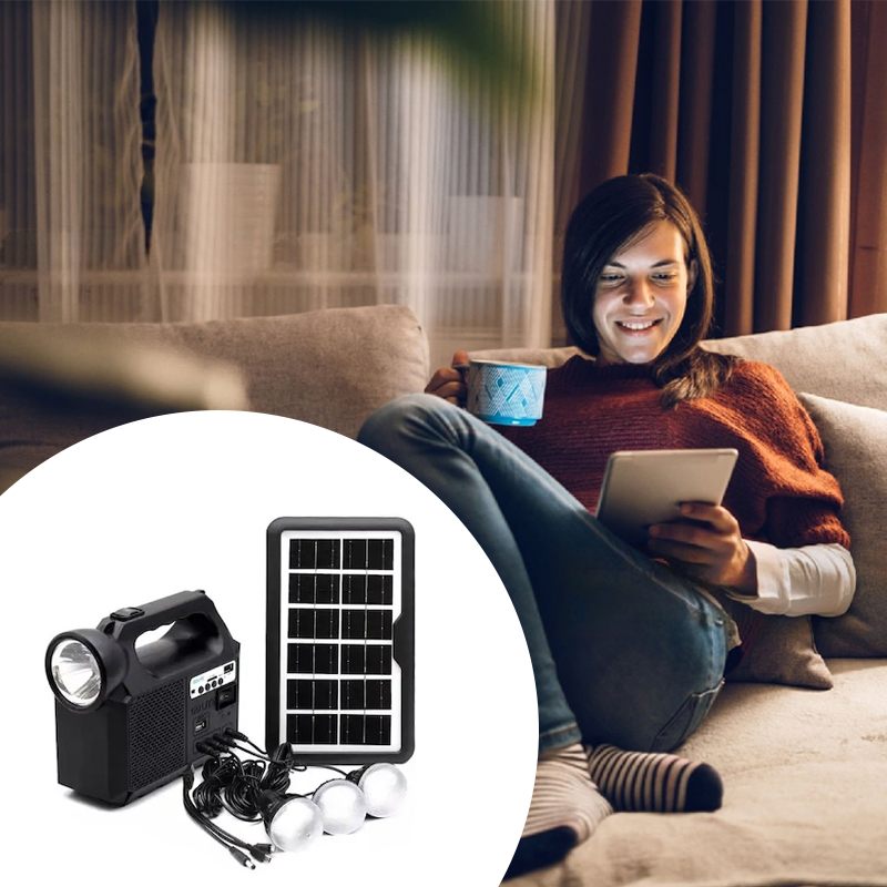 Переносний ліхтар із сонячною панеллю GDLITE GD101 Solar Panel, 4500 мАг, 3 лампочки 3W, USB вихід. Ця сонячна система розроблена для забезпечення надійного аварійного освітлення та заряджання ваших гаджетів без необхідності використання електроенергії з мережі.