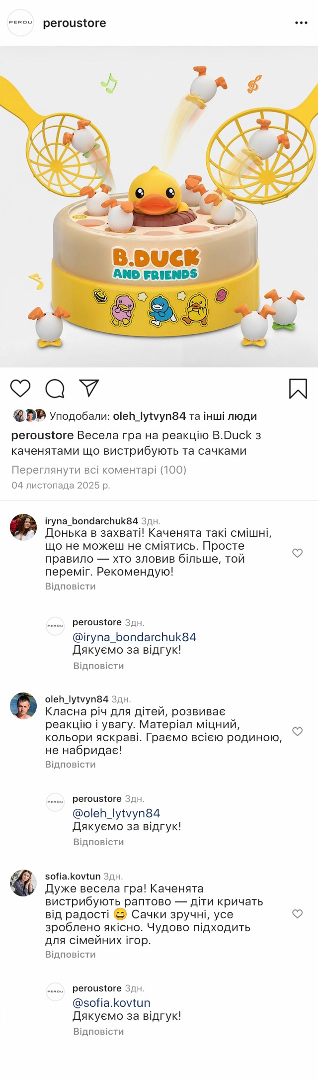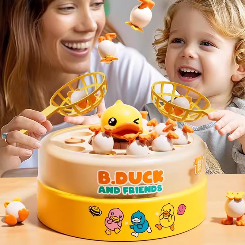 Каченята раптово вистрибують із ігрового поля, а завдання дитини – впіймати їх якомога швидше за допомогою сачків. Це покращує координацію рук і очей та точність рухів, а також навчає блискавично приймати рішення в умовах непередбачуваності.